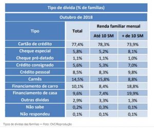 De acordo com a CNC, o cartão de crédito é responsável por 77,4% do endividamento das famílias, seguido de carnês (14,5%), financiamento de carro (10,1%), financiamento de casa (9,6%), Crédito Pessoal (8,5%), Cheque Especial (5,8%) e Crédito Consignado (5,6%).